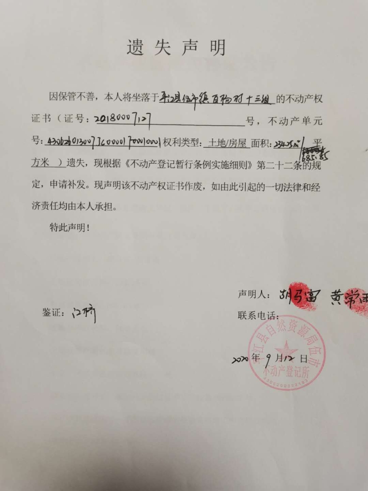 胡马富 黄常丽 不动产权证遗失声明