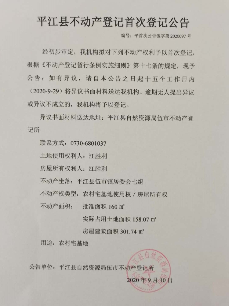 江胜利 平江县不动产首次登记公告 伍字第2020097号