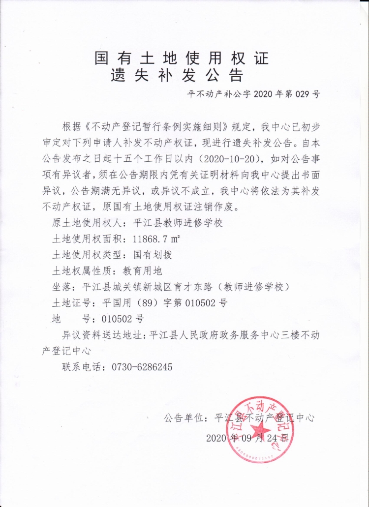 平江县教师进修学校国有土地使用权证遗失补发公告.jpg