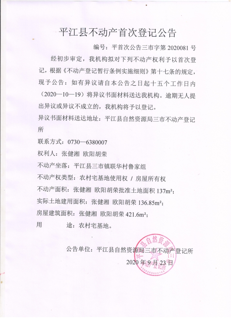 张健湘 欧阳胡荣不动产首次登记公告