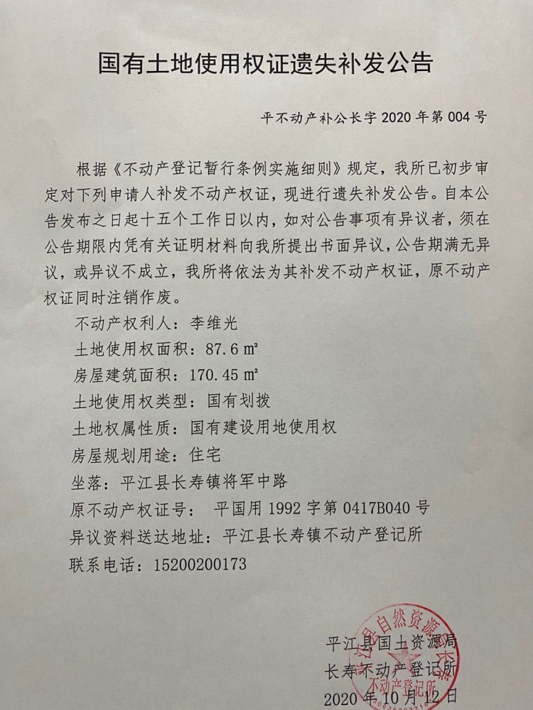 李维光不动产登记遗失补发公告