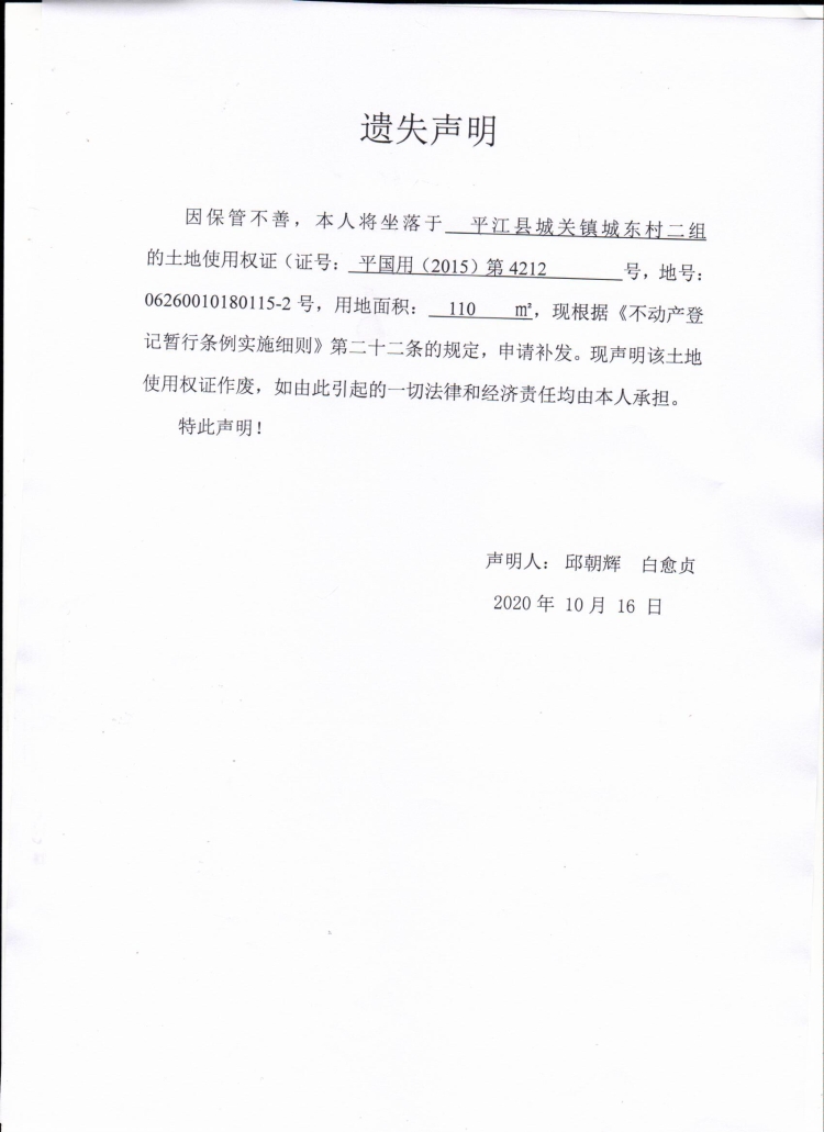 邱朝辉、白愈贞国土证遗失声明1.jpg