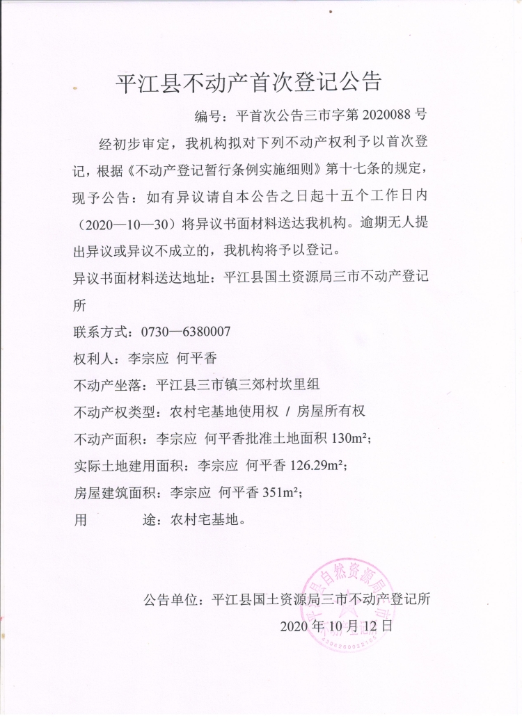 李宗应 何平香不动产首次登记公告