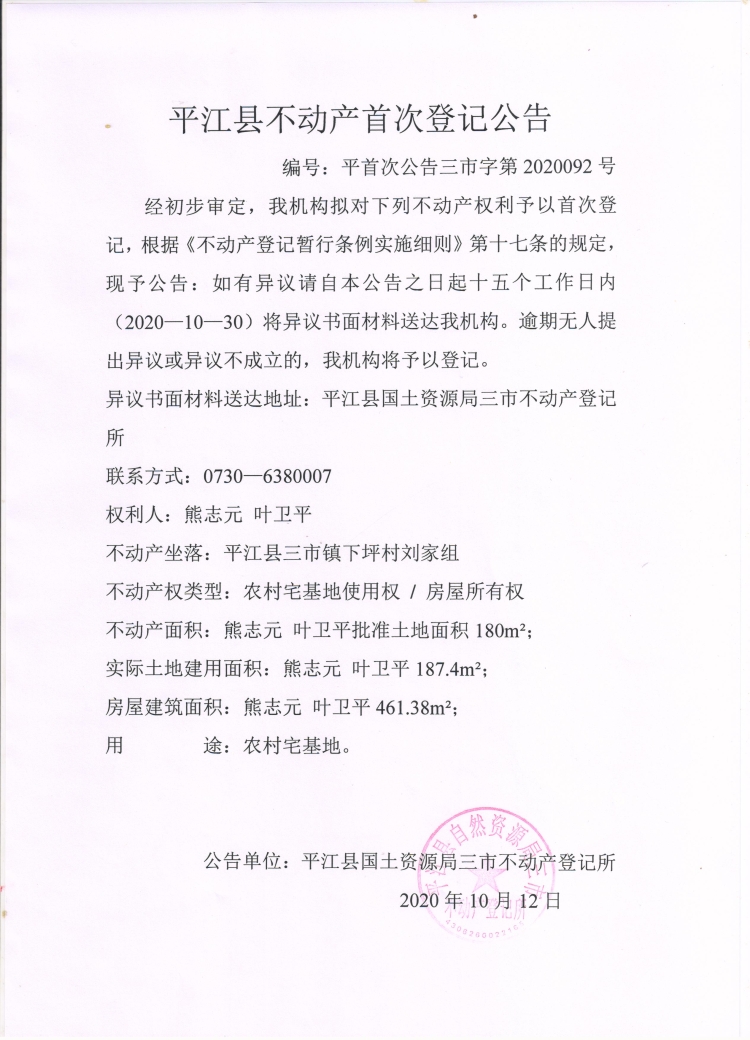 熊志元 叶卫平不动产首次登记公告