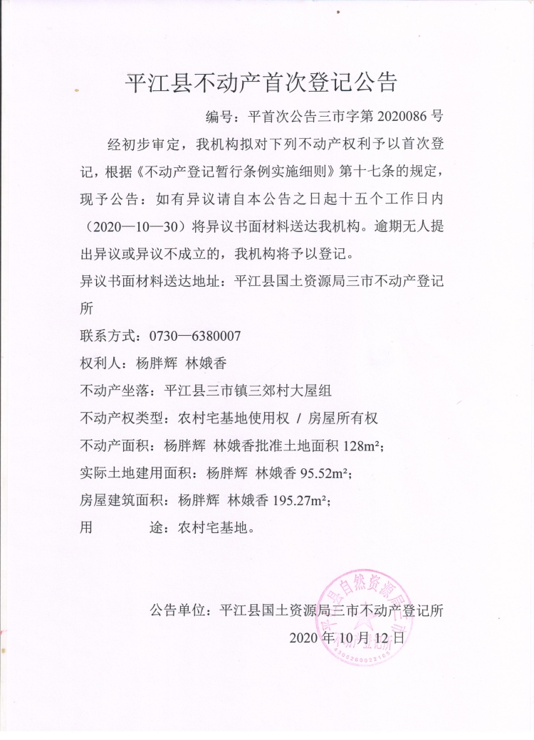 杨胖辉 林娥香不动产首次登记公告