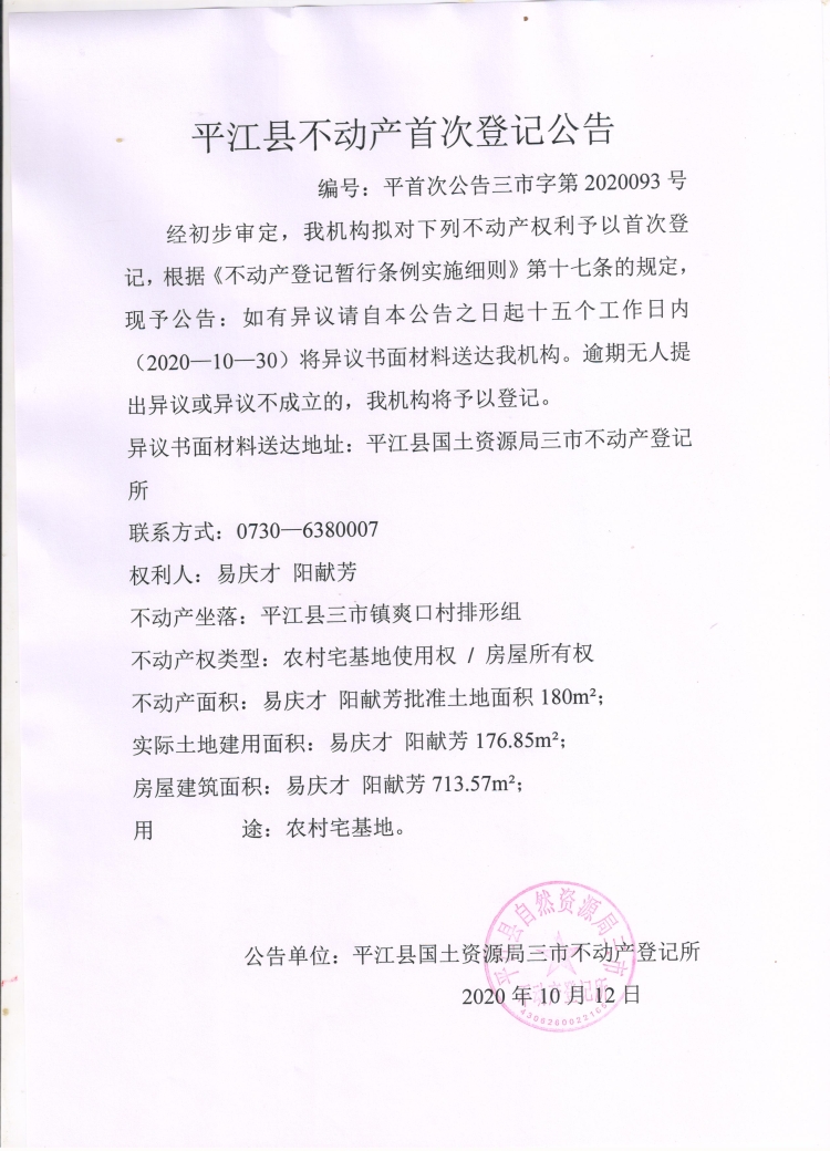 易庆才 阳献芳不动产首次登记公告