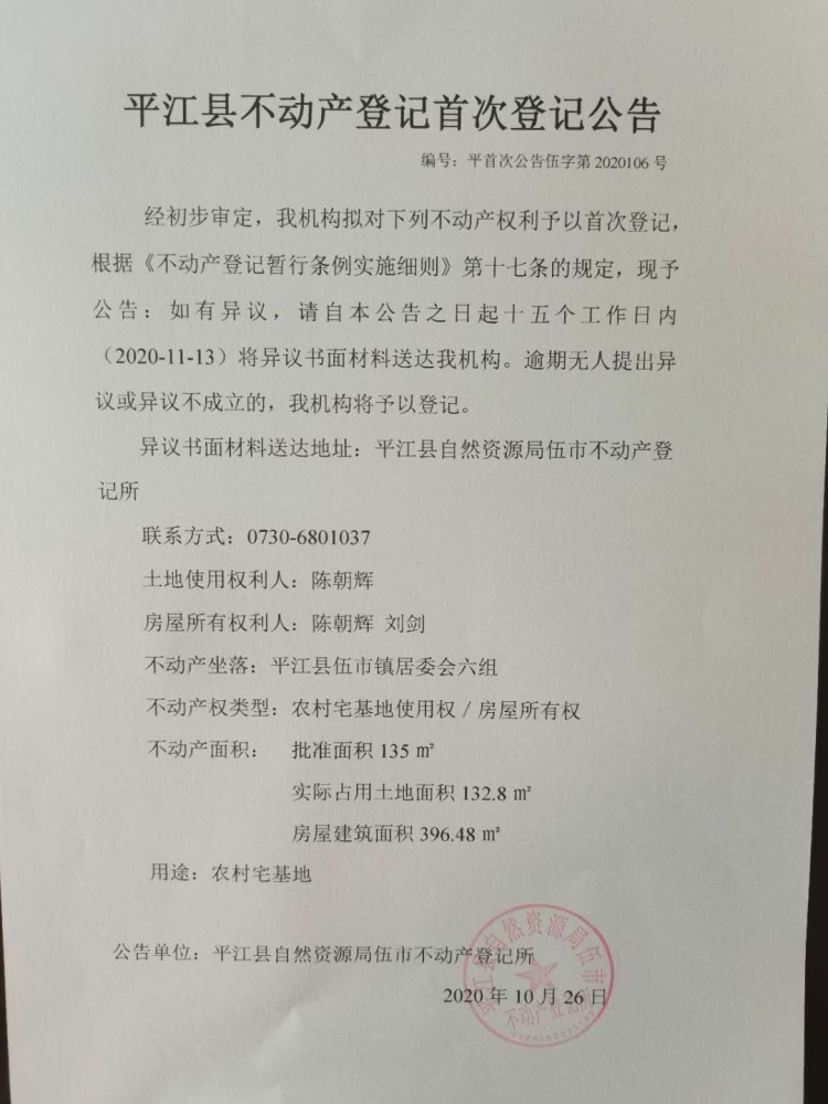 陈朝辉 刘剑 平江县不动产首次登记公告 伍字第2020106号