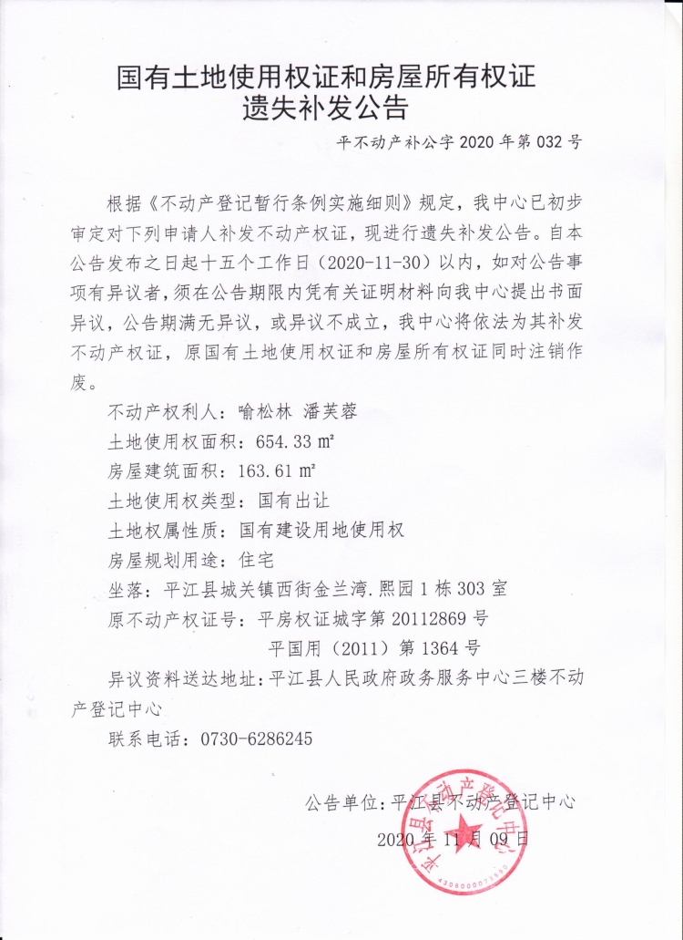 喻松林 潘芙蓉国有土地使用权证和房屋所有权证遗失补发公告.jpg