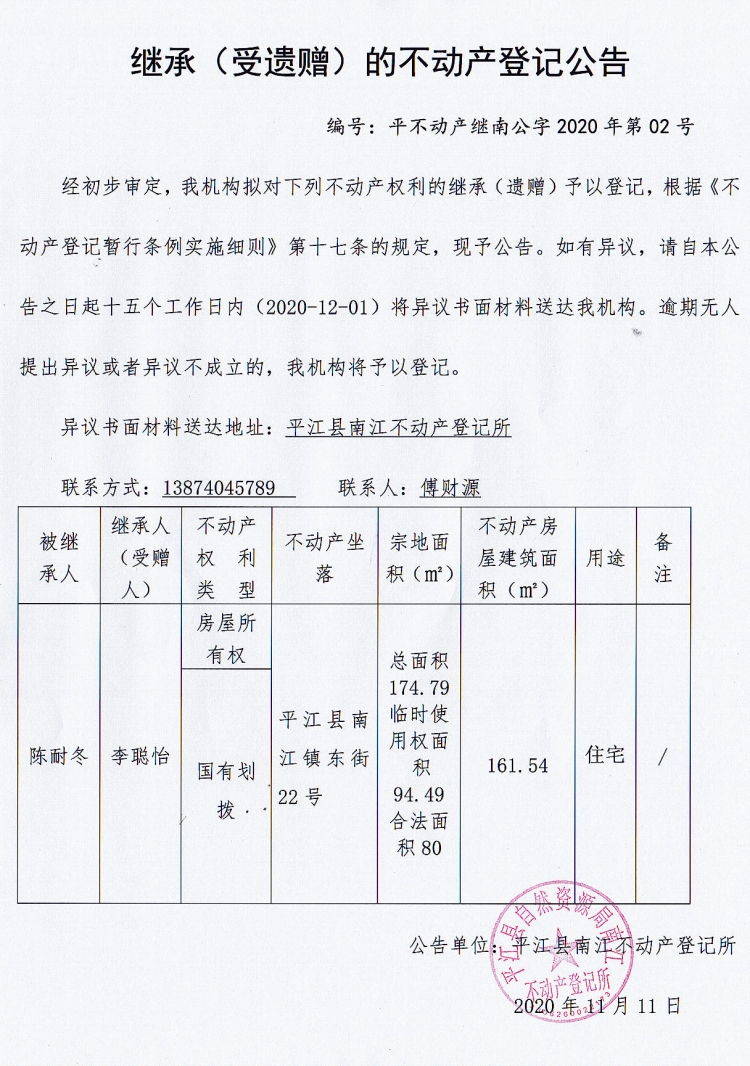 李聪怡继承(受遗赠)的不动产登记公告