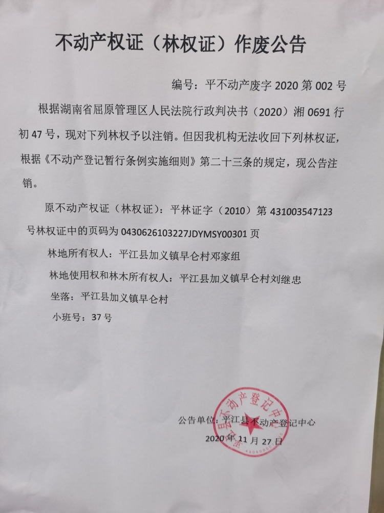 平江县加义镇早仑村刘继忠林权作废公告