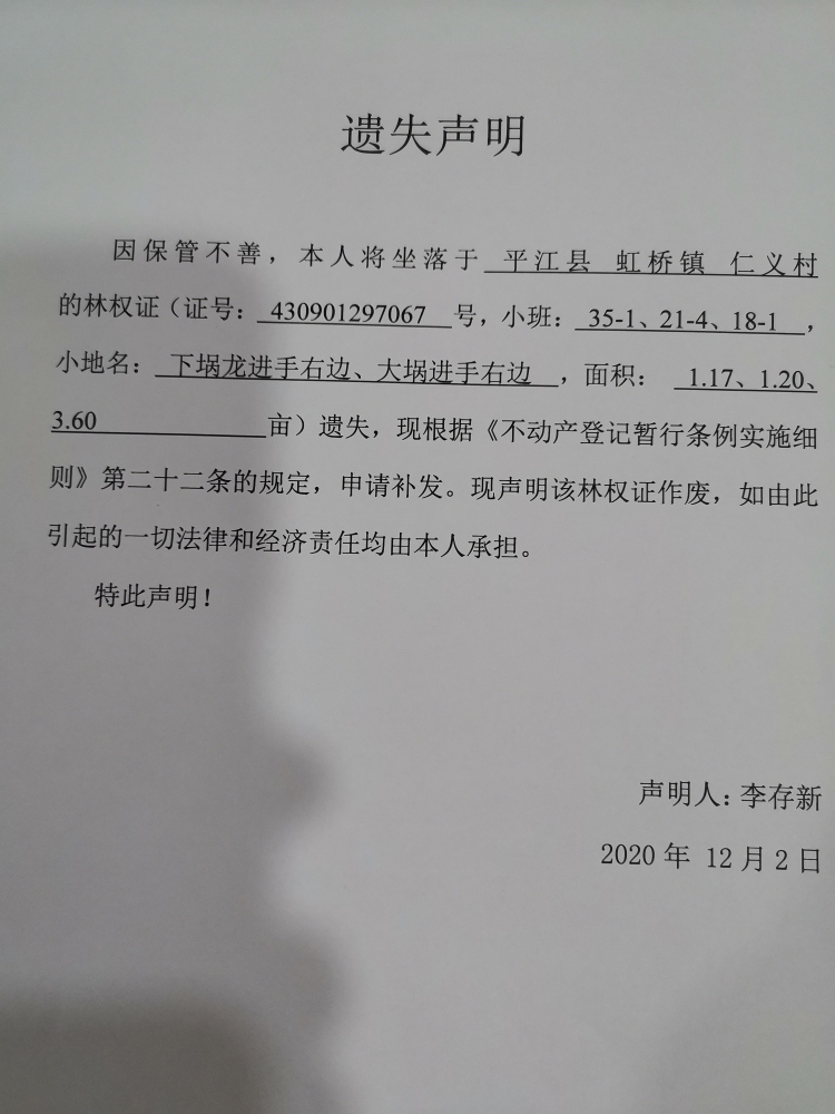 李存新林权证遗失声明