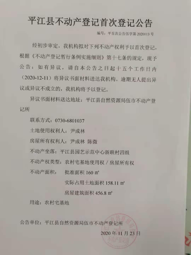 尹成林 陈微平江县不动产首次登记公告 伍字第2020113号