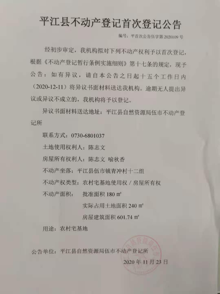 陈志文 喻秋香 平江县不动产首次登记公告伍字第2020109号