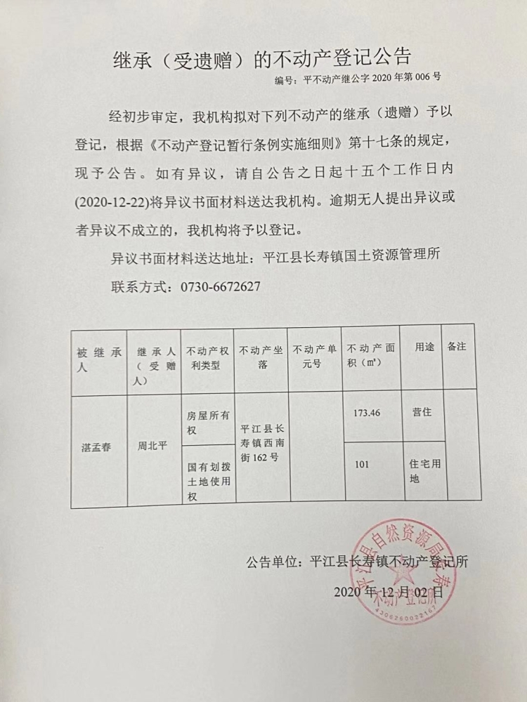 周北平继承(受遗赠)的不动产登记公告