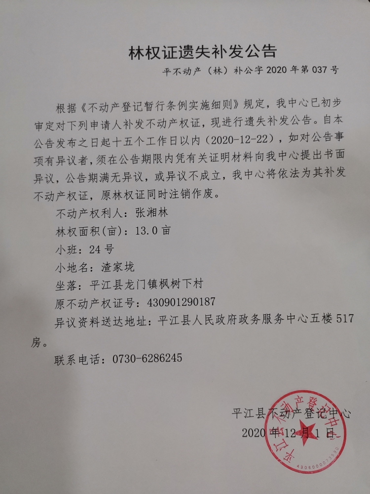 张湘林林权证遗失补发公告