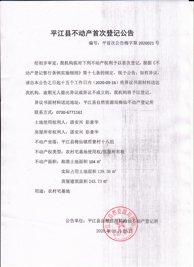 湛安兴 彭意华平江县不动产首次登记公告