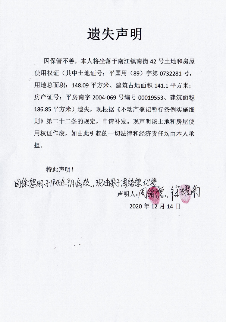 徐恕明 徐耀南国有土地使用权证、房屋使用权证遗失声明