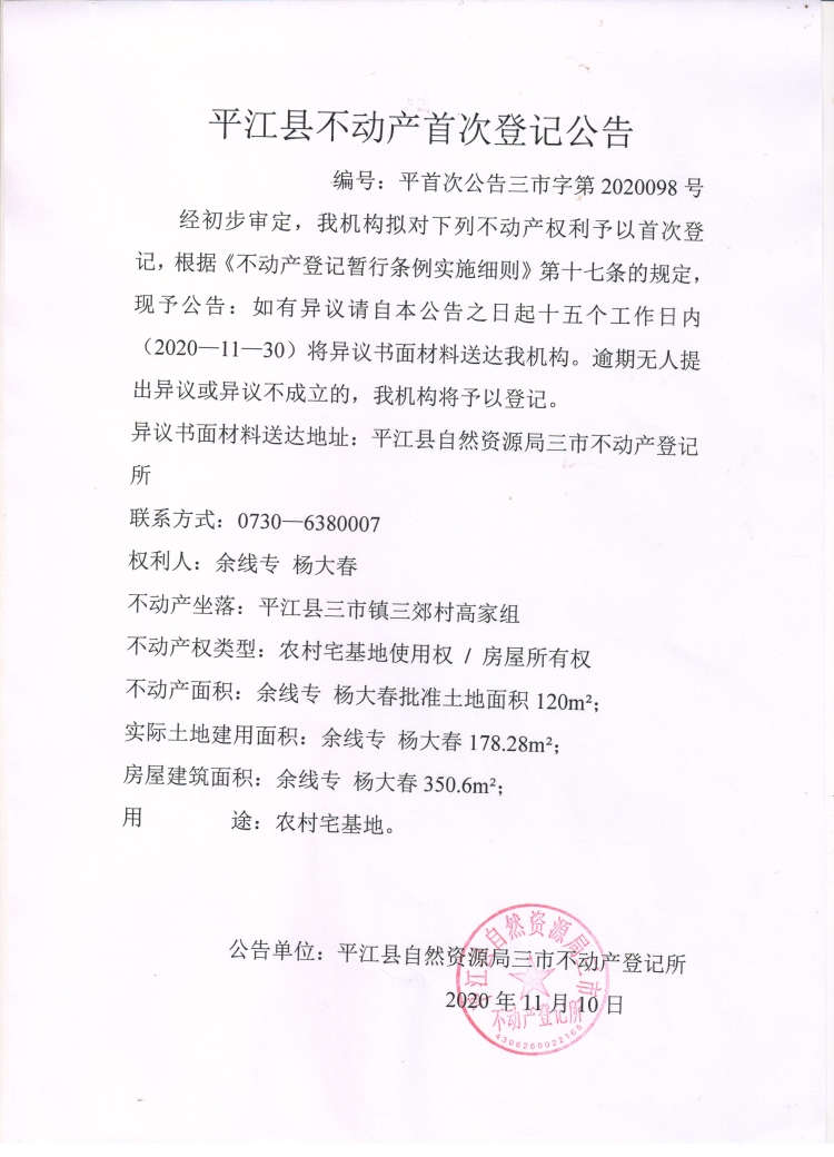 余线专 杨大春不动产首次登记公告