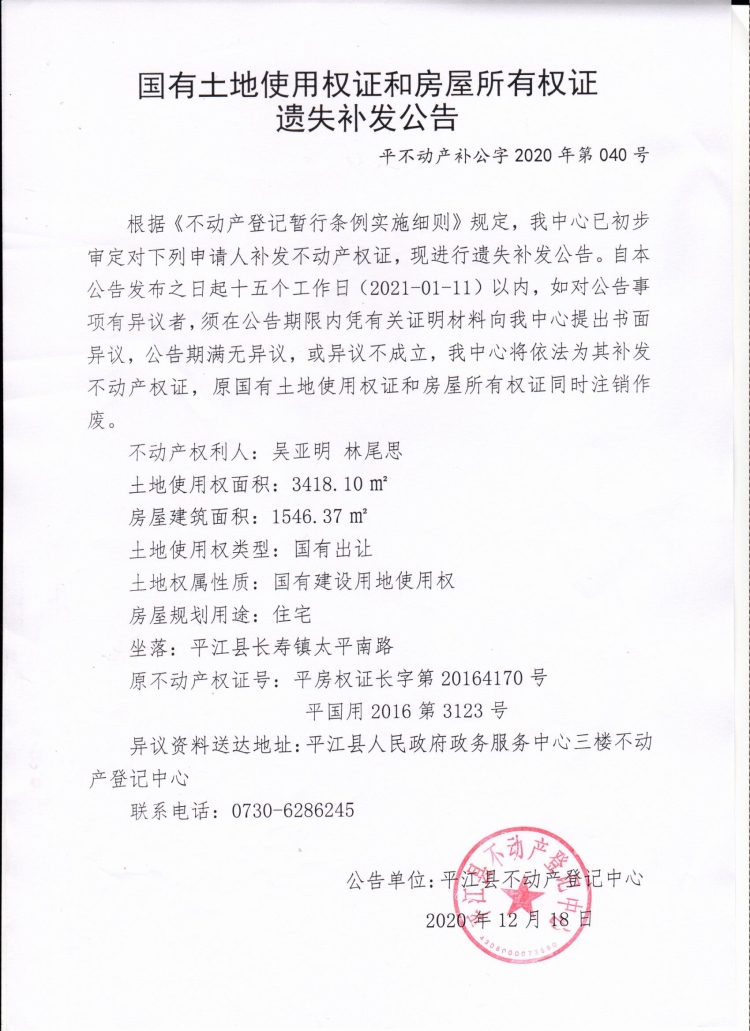 吴亚明 林尾思国有土地使用权证和房屋所有权证遗失补发公告.jpg