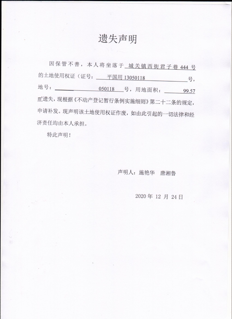 施艳华、唐湘鲁国土证遗失声明1.jpg