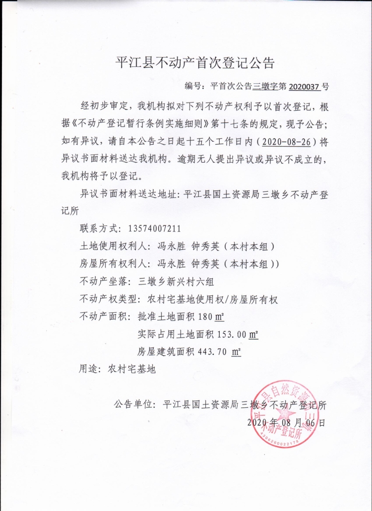 平首次公告三墩字第2020037号冯永胜 钟秀英