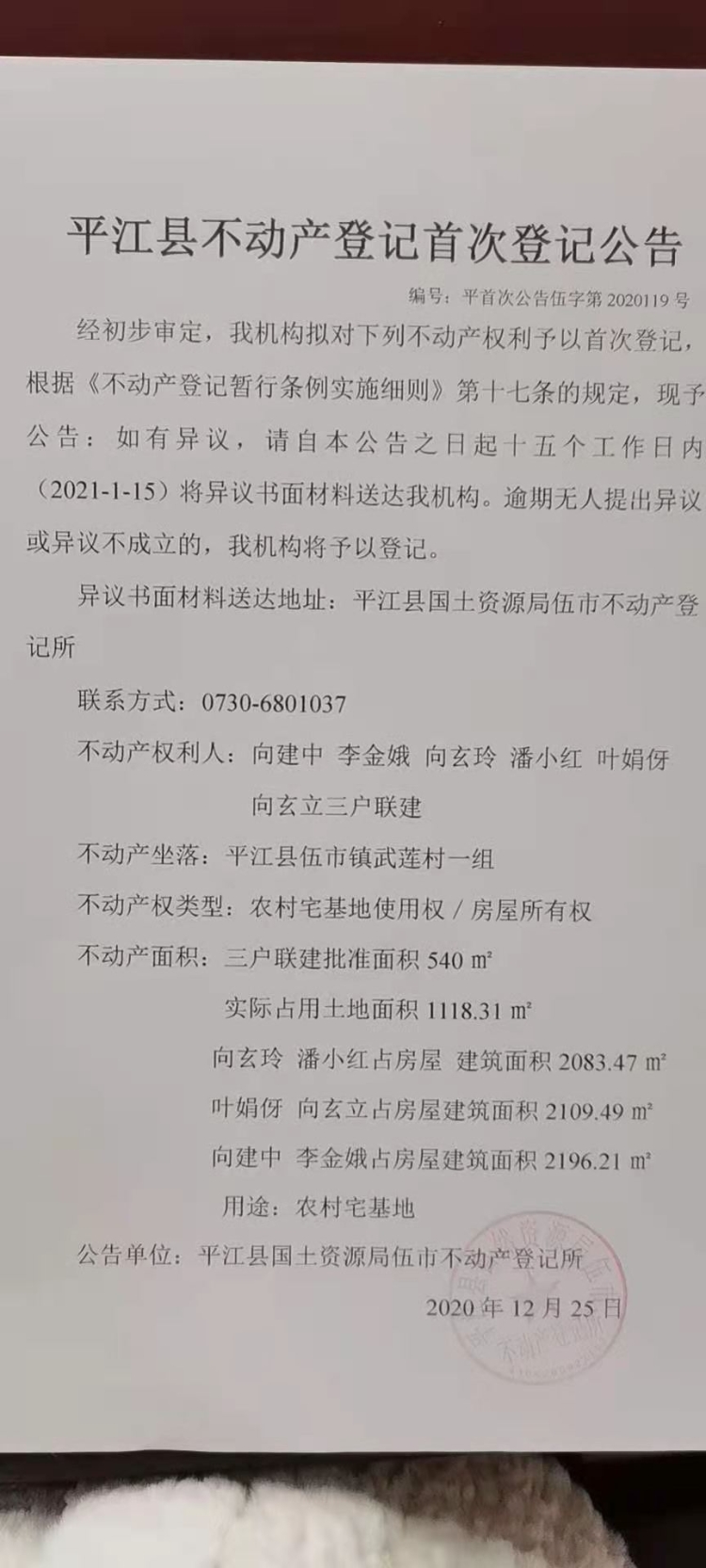 向建中 李金娥 向玄玲 潘小红 叶娟伢 向玄立三户联建平江县不动产首次登记公告伍字第2020119号