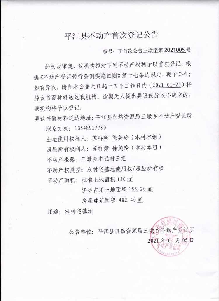 平首次公告三墩字第2021005苏群荣 徐美玲