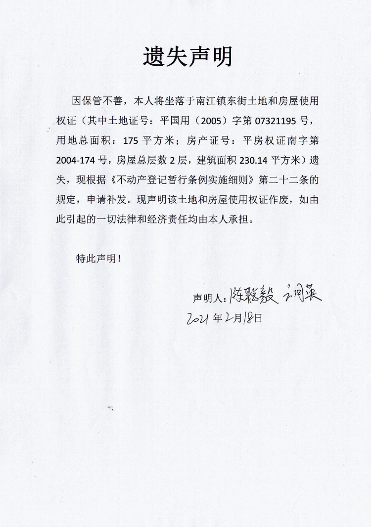 陈聪毅 方月英国有土地使用权证和房屋所有权证遗失声明