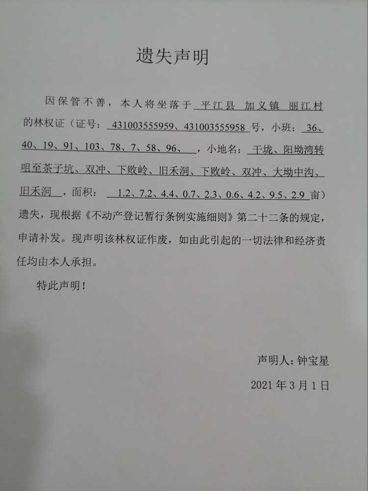 钟宝星林权证遗失声明