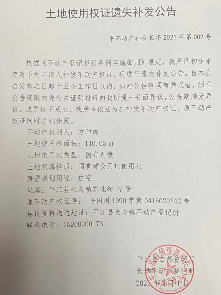 方和娣土地使用权证遗失补发公告