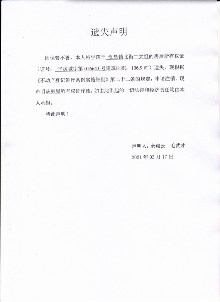 余翔云、毛武才房屋所有权证遗失声明.jpg