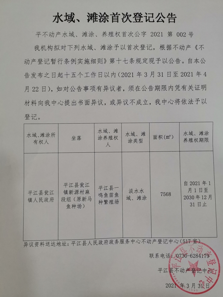平江县一鸣鱼苗鱼种繁殖场水域、滩涂首次登记公告