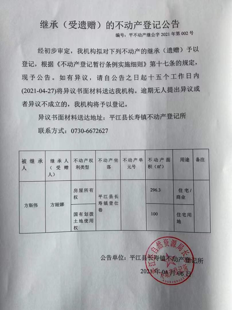 来源:王震英 熊姣姣继承(受遗赠)的不动产登记公告