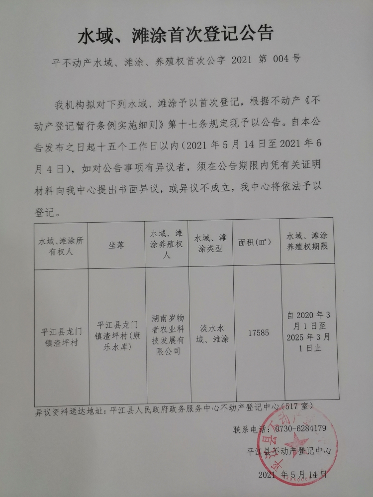 龙门镇渣坪村康乐水库水域、滩涂首次登记公告