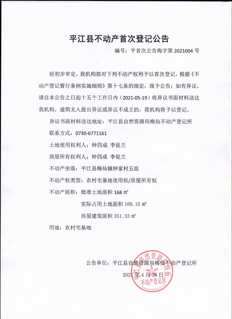 钟四成 李促兰不动产首次登记公告