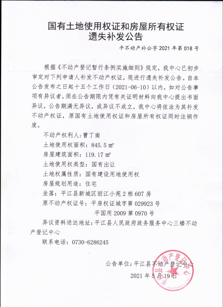 曹丁南国有土地使用权证和房屋所有权证遗失补发公告.jpg