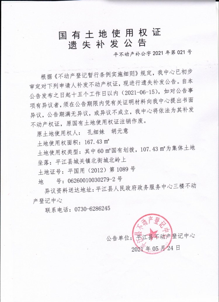 孔细妹、胡元意国有土地使用权证遗失补发公告.jpg