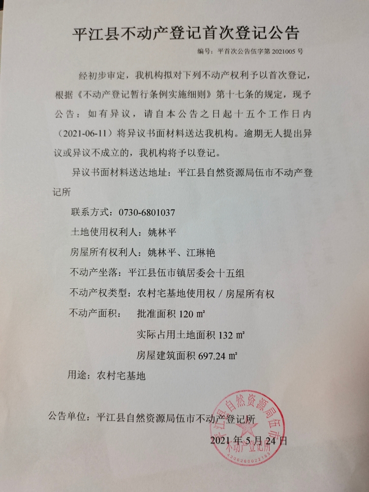 姚林平、江琳艳 平江县不动产登记首次登记公告 平首次公告伍字第2021005号
