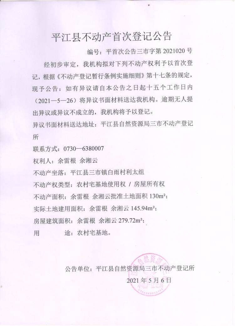 余雷根 余湘云不动产首次登记公告