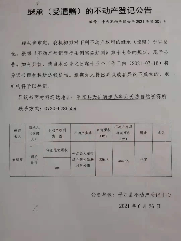 胡宇、童帅继承(受遗赠)的不动产登记公告