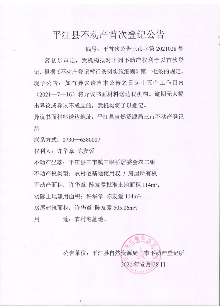 许华章、陈友爱不动产首次登记公告