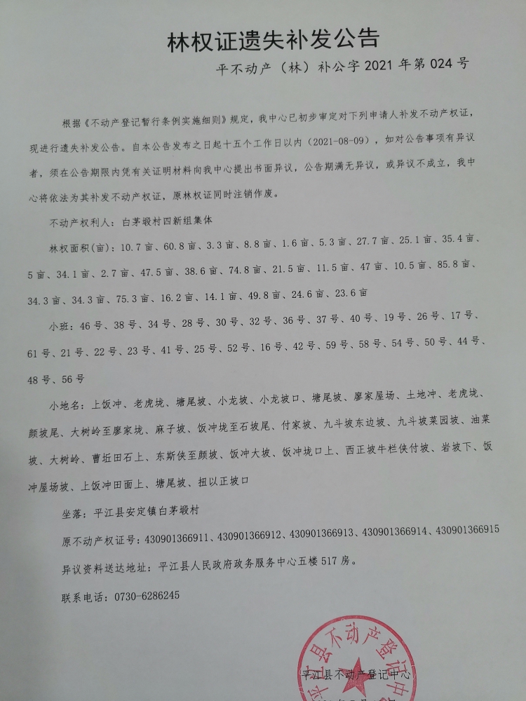 白茅塅村四新组集体林权证遗失补发公告