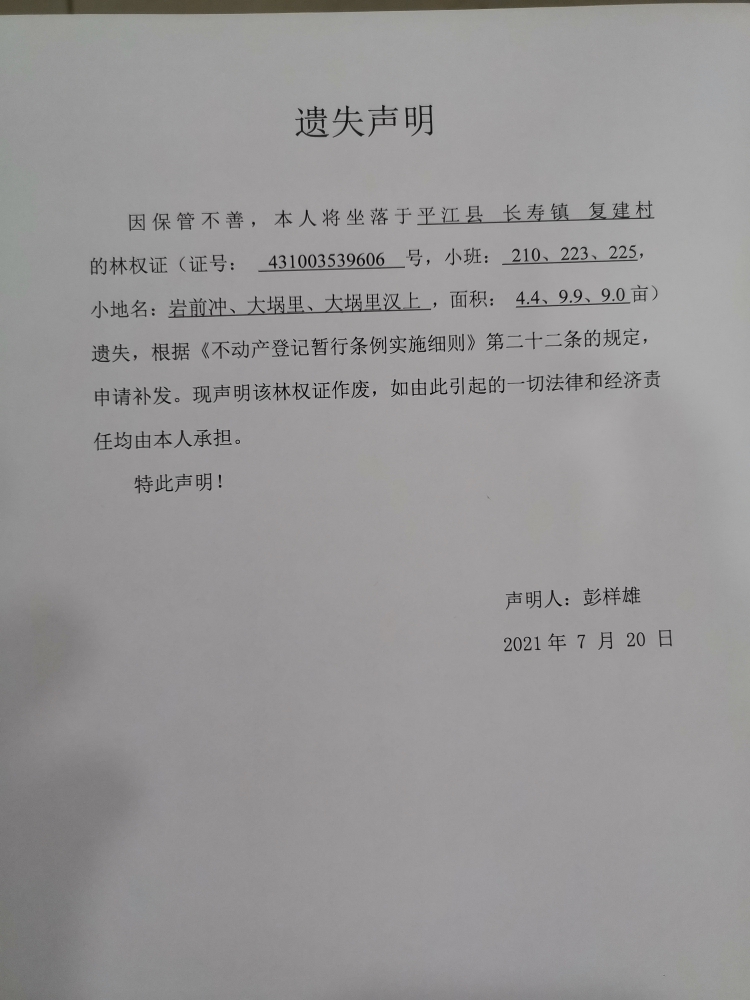 彭样雄林权证遗失声明