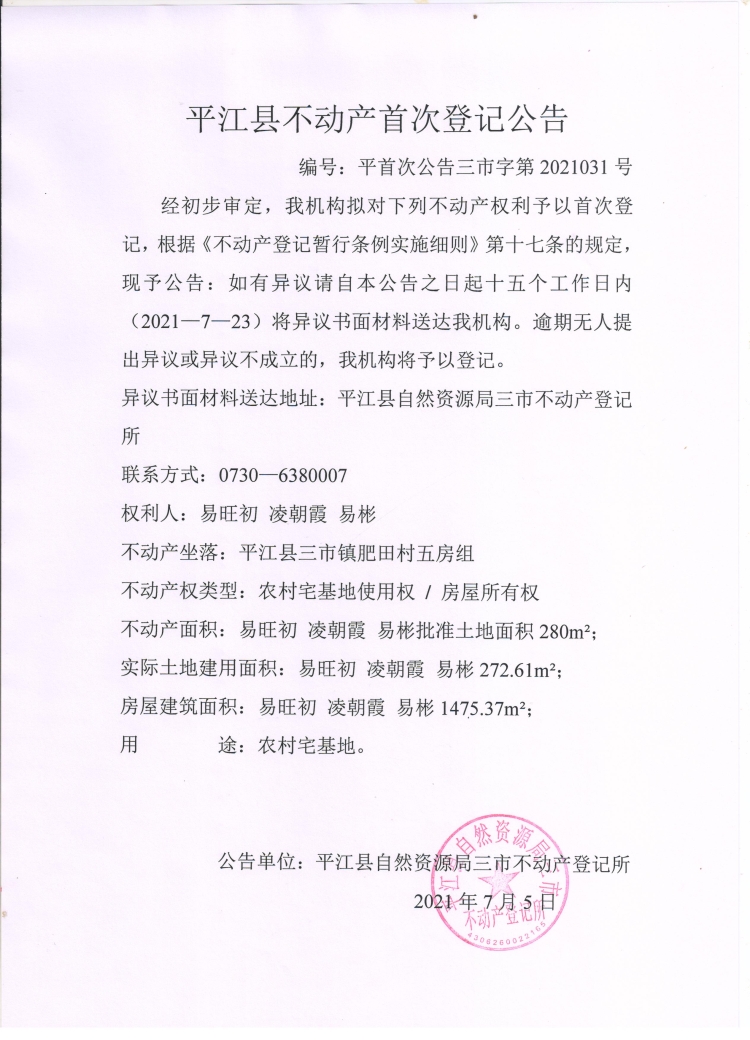 易旺初 凌朝霞 易彬不动产首次登记公告