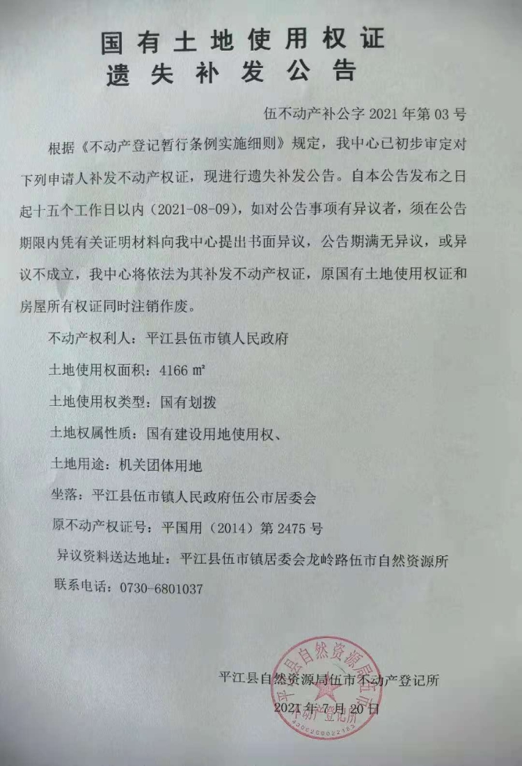 平江县伍市镇人民政府 遗失补发公告