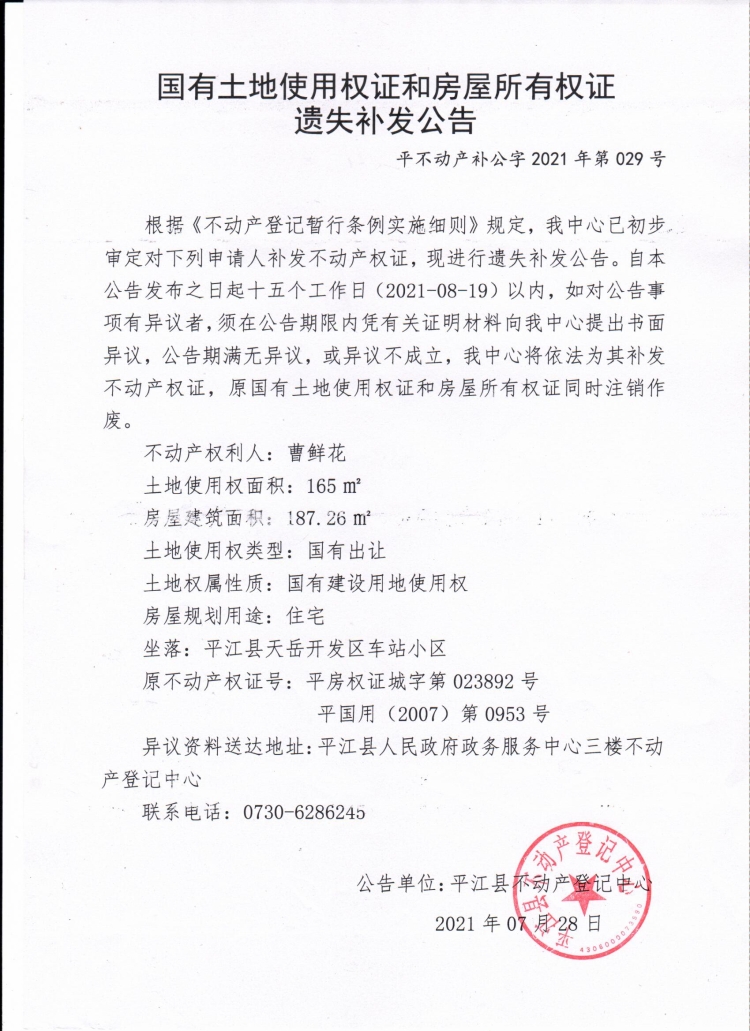 曹鲜花国有土地使用权证和房屋所有权证遗失补发公告.jpg
