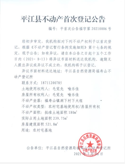 毛觉先、喻乐佳不动产首次登记公告