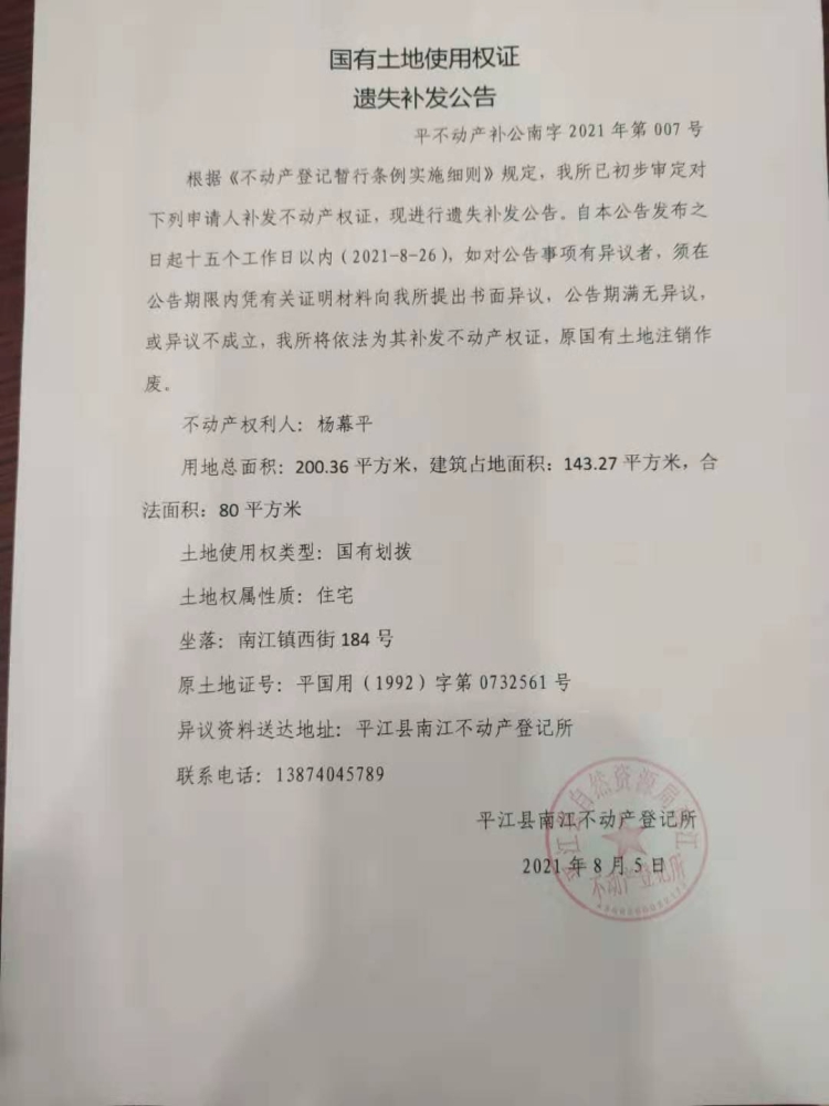 杨幕平国有土地使用权证遗失补发公告