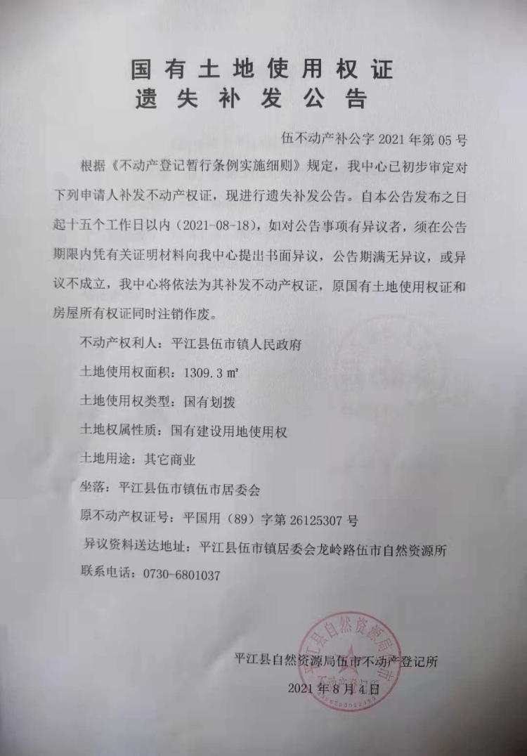 平江县伍市镇人民政府 国有土地使用权证遗失补发公告