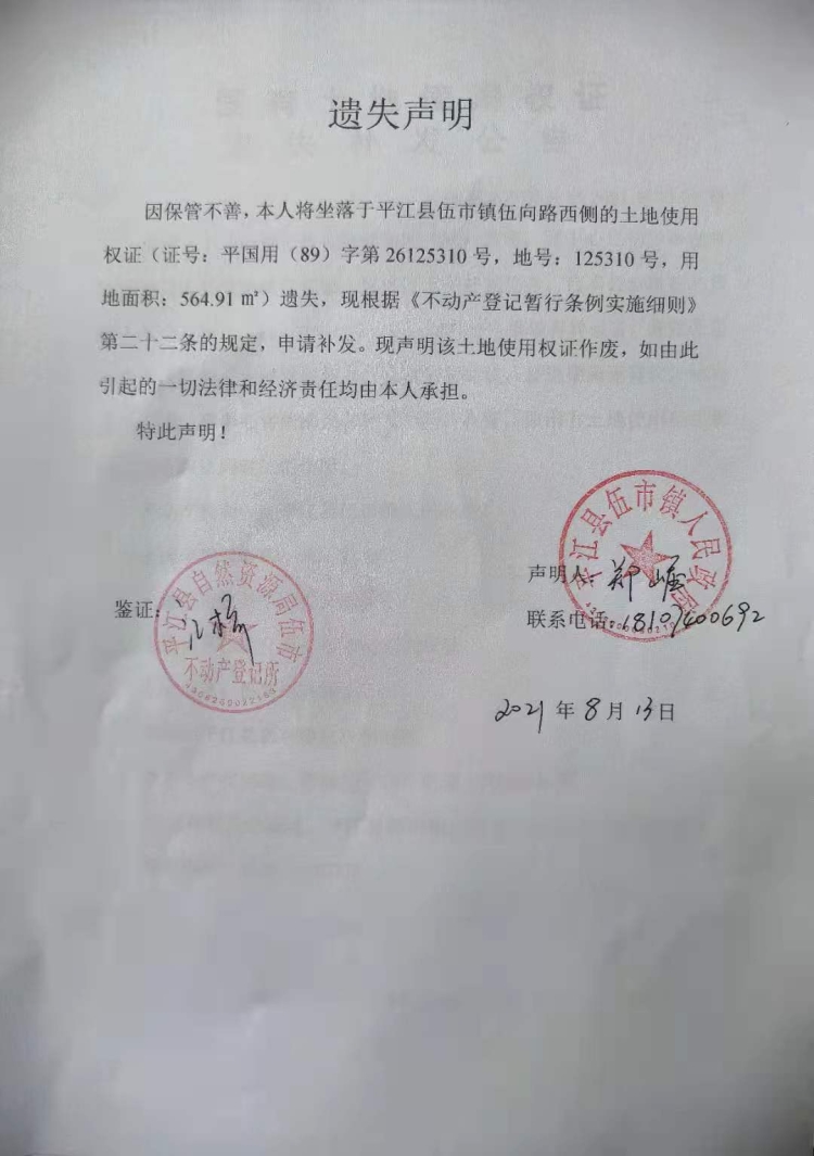 平江县伍市镇人民政府 国有土地使用权证遗失声明